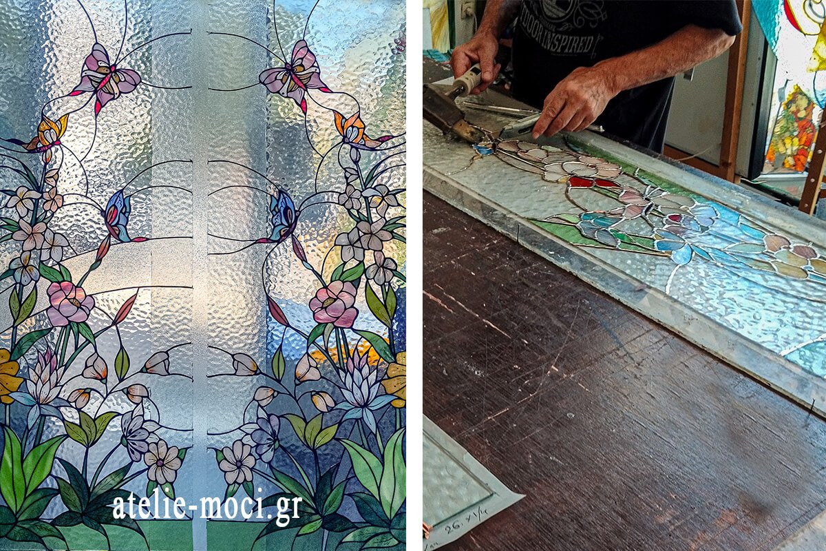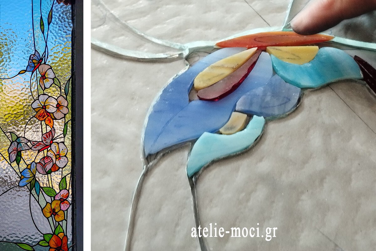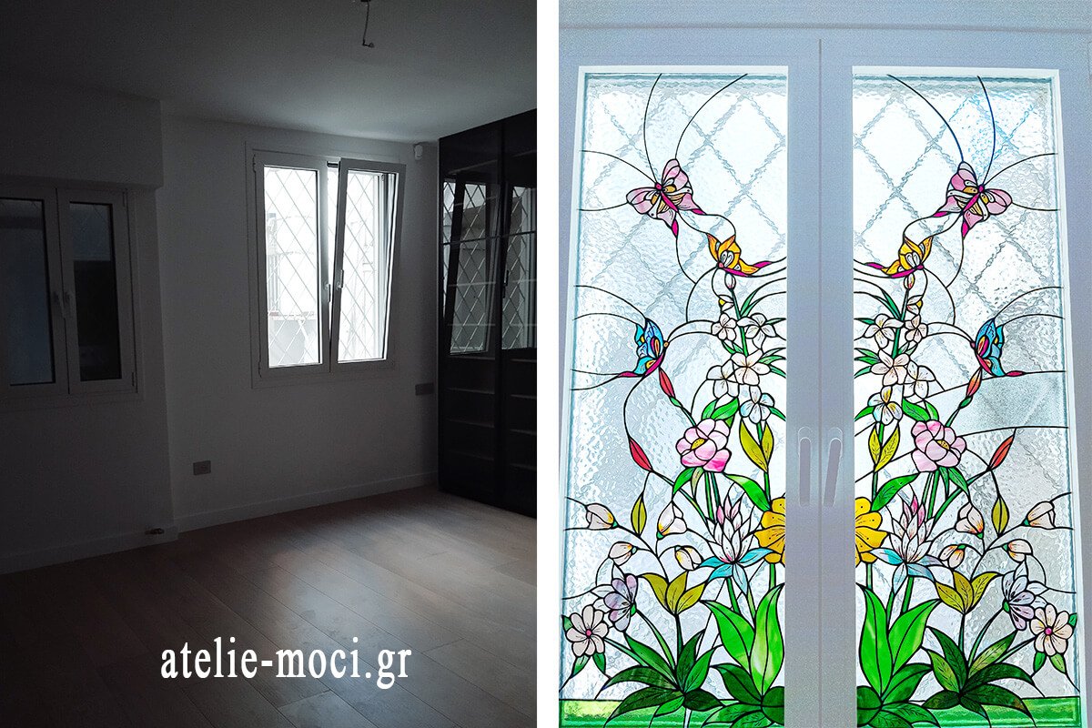 Μια σύνθεση από πολύχρωμα λουλούδια και πεταλούδες που «ανθίζουν» πάνω σε μια γυάλινη επιφάνεια. Το βιτρώ είναι τοποθετημένο στο δωμάτιο της γκαρνταρόμπας αποτυπώνει την αρμονία του έργου μέσα στο περιβάλλον του σπιτιού προσδίδοντας μια φυσική και ανάλαφρη αίσθηση στον χώρο. Η τεχνική Tiffany αναδεικνύει κάθε λεπτομέρεια, με τις καμπύλες των πετάλων και τις αποχρώσεις των χρωμάτων να δημιουργούν μια εντυπωσιακή εικόνα.