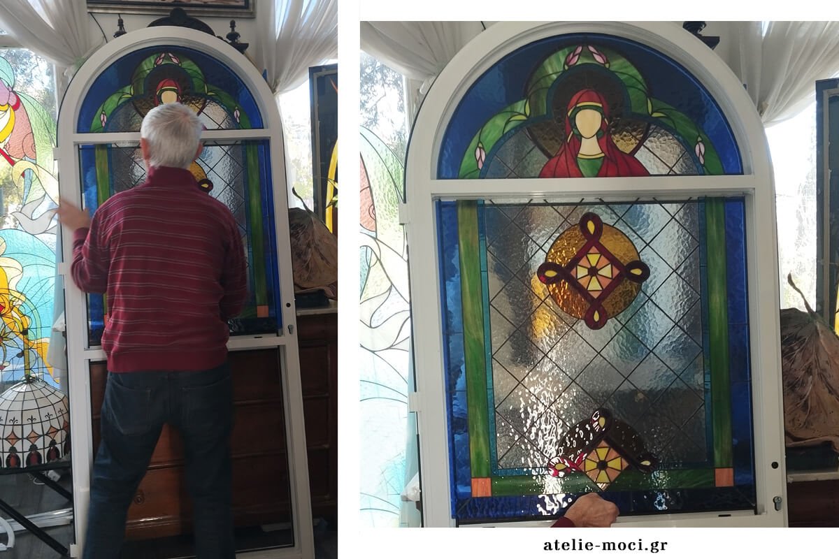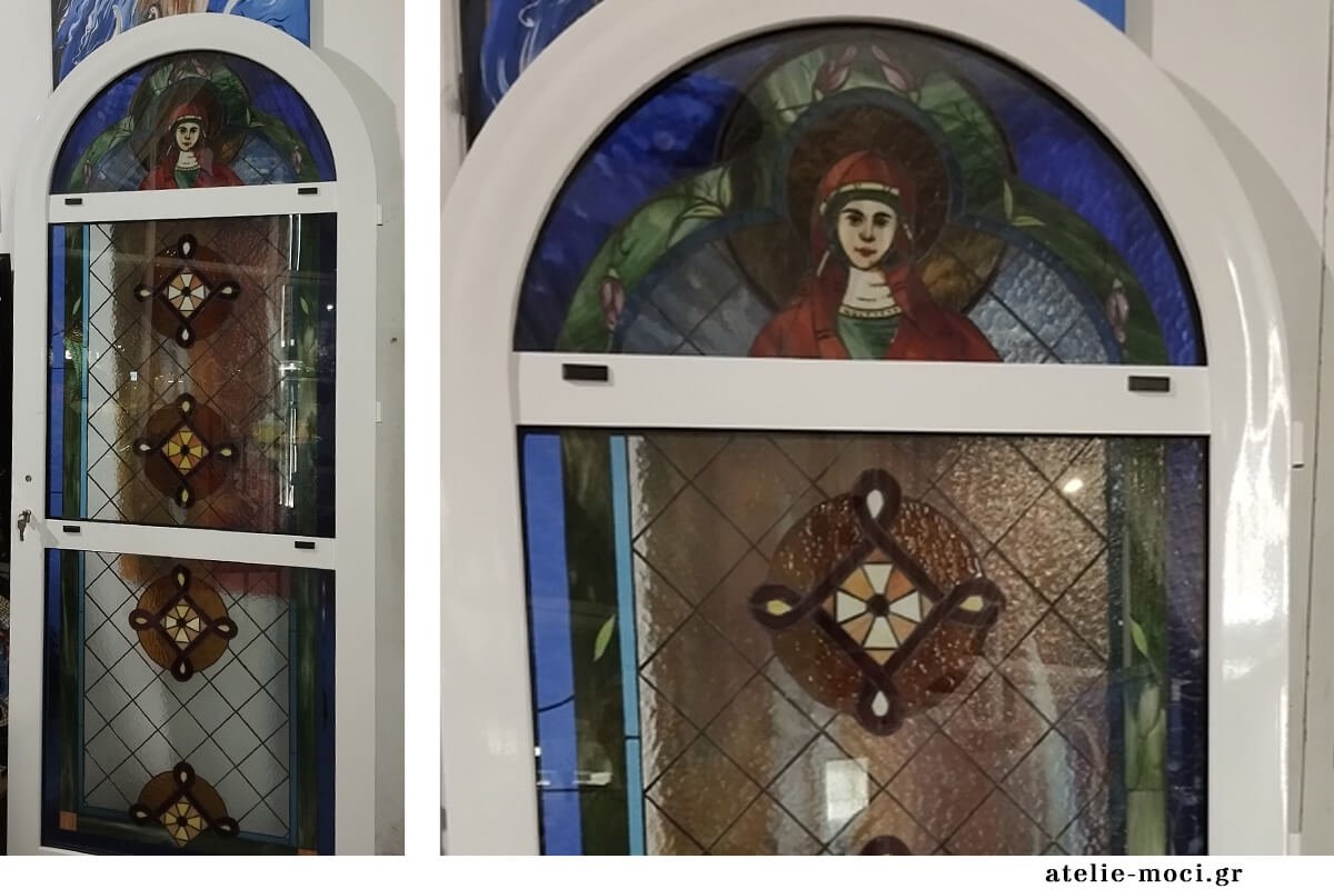 Portfolio: Μια τοξωτή θύρα με εκκλησιαστικό θέμα, με την Απεικόνιση της Παναγίας: Το Κέντρο της Πίστης μας.Στο επάνω μέρος της κατασκευής, στην κορυφή της τοξωτής καμπύλης, δεσπόζει η μορφή της Υπεραγίας Θεοτόκου. Η επιλογή αυτή δεν είναι τυχαία. Η Παναγία αποτελεί το μεσίτη μεταξύ ουρανού και γης, και η τοποθέτησή της στο ψηλότερο σημείο του παραθύρου επιτρέπει στο φυσικό φως να διαπερνά το πρόσωπό Της, δημιουργώντας μια ατμόσφαιρα κατάνυξης που αγκαλιάζει όλο τον χώρο.