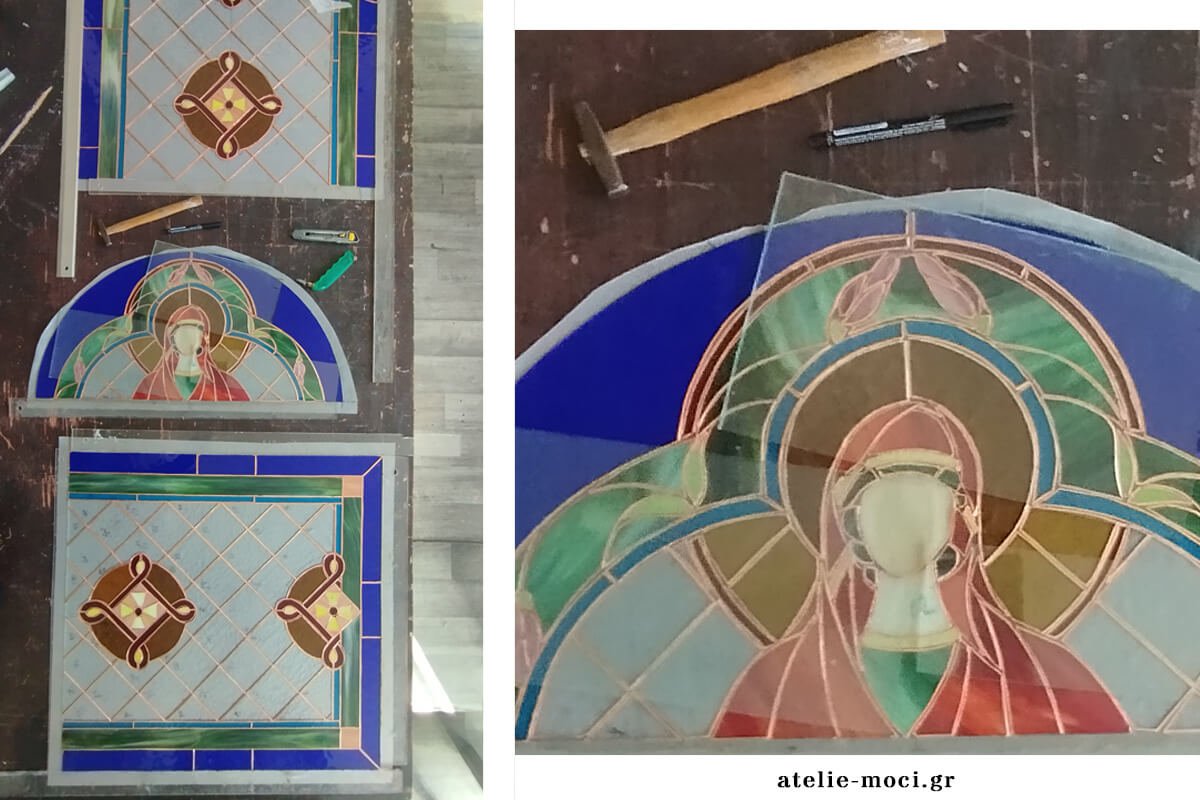 Στο Atelie Moci, αρνούμαστε τις εύκολες λύσεις των αυτοκόλλητων ταινιών ή των απλών εκτυπώσεων σε γυαλί (αυτοκόλλητες μεμβράνες πάνω σε ένα ενιαίο τζάμι που φθείρονται και ξεκολλάνε. Αποφεύγουμε, επίσης, το Fusing βιτρω καθώς τα γυαλιά λιώνουν και “απλώνουν” μέσα στον φούρνο, με αποτέλεσμα να χάνεται η αυστηρότητα των γραμμών που απαιτεί μια ιερή εκκλησιαστική μορφή, στερείται της απαραίτητης λεπτομέρειας και ζωντάνιας για μια γνήσια καλλιτεχνική δημιουργία.